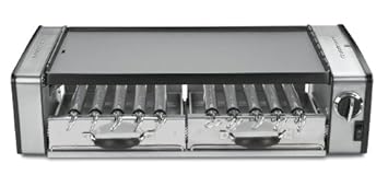 Cook up a range of outdoor favorites any time of year with this unique indoor grill. More than just a countertop grill, however, the clever appliance features a two-tier design that allows for expanded cooking capabilities. The unit's bottom tier offers automatically rotating skewers that evenly cook shish kabobs or hot dogs to perfection, while its top tier provides a reversible nonstick die-cast grill/griddle plate--use the grill side for cooking hamburgers, pork chops, grilled-cheese sandwiches, or slices of eggplant and pineapple; flip it over to the griddle side when making pancakes, omelets, and other breakfast fare. Thoughtfully designed, the unit also provides adjustable temperature control, a simple on/off switch, a power "on" indicator light, solid stainless and die-cast housing for long-lasting durability, and removable dishwasher-safe drip trays for quick cleanup. A 10-piece stainless-steel skewer set and a 10-piece hot-dog roller set come included. The 1700-watt grill measures approximately 24-1/2 by 13-1/2 by 7-8/9 inches.